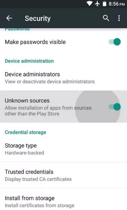 - Buka Pengaturan > Keamanan, lalu aktifkan opsi “Izinkan pemasangan dari sumber yang tidak dikenal”.